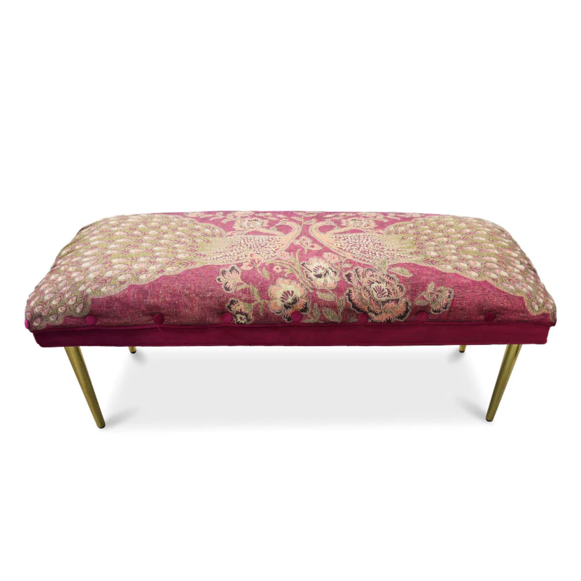 Add a flash of vibrant luxury to your decor with the Claire Fuchsia Bench — a handcrafted American‑made accent piece that serves as seating, display, or a bold focal point. With its vivid peacock fuchsia color, brass legs, and overlay detail, this bench offers both flair and function.