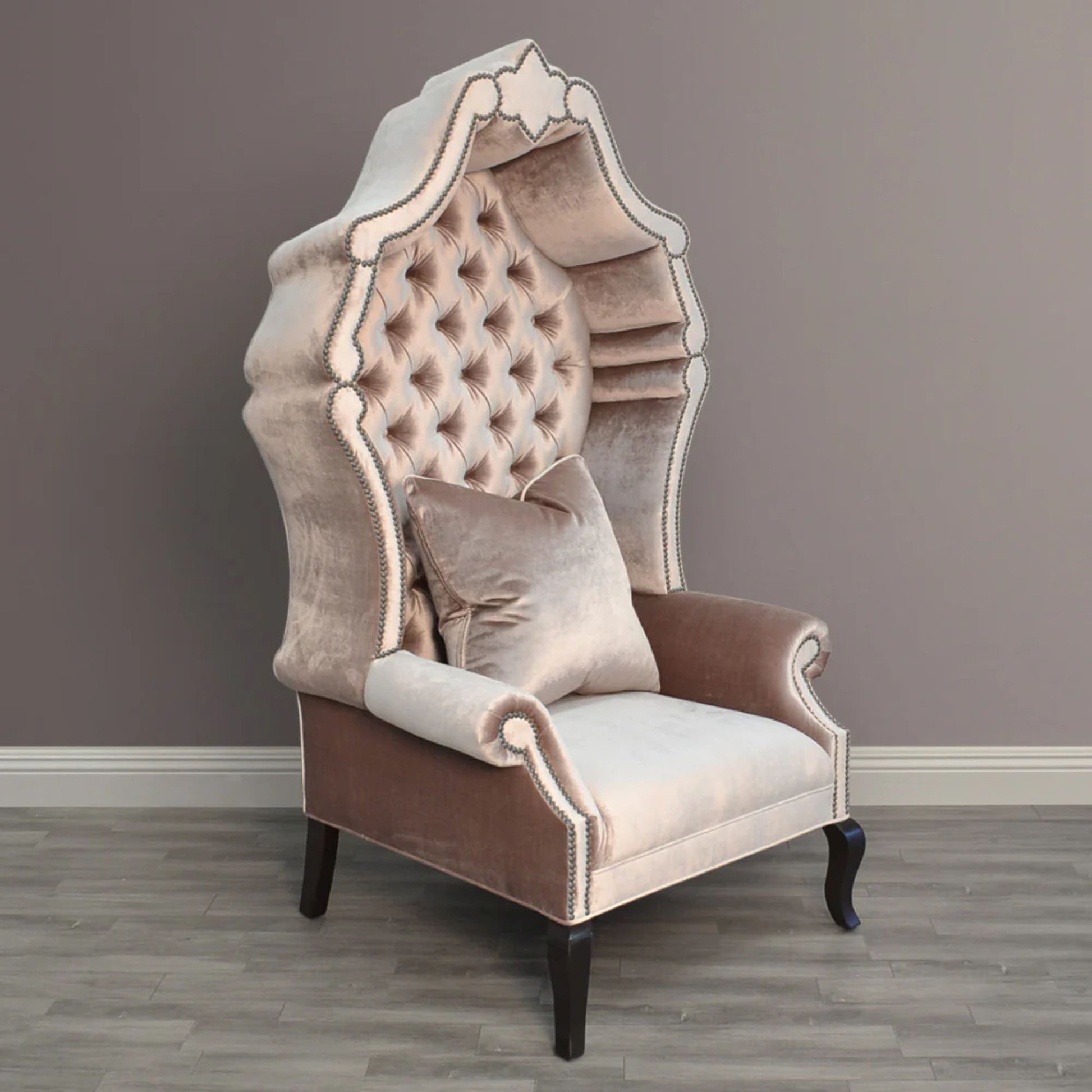 Meet the Overcup Chair — a handcrafted, made-to-order accent piece designed for lasting comfort and timeless style. Upholstered in your choice of luxe velvet fabrics, it features elegant hooded arms, nailhead trim, and dark walnut-finished legs for a look that’s both bold and refined. Whether used as a commanding focal point or a cozy retreat, this chair blends grandeur with inviting comfort in any space.