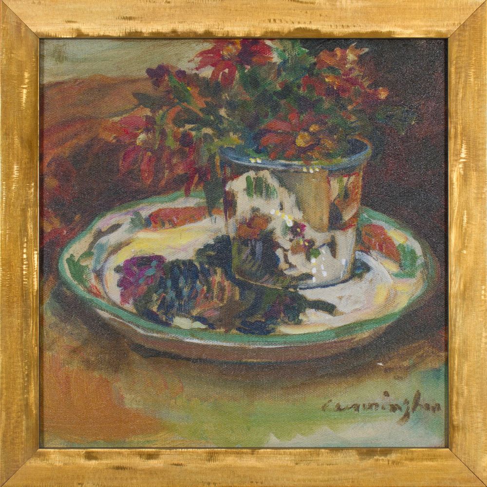 The Pearce Wall Art captures a vibrant still-life composition, featuring a plate topped with a cup filled with delicate flowers, set upon a colorful, textured table. The artwork celebrates a harmonious riot of colors, bringing energy, warmth, and visual delight to the scene. Framed in a natural wood frame, this piece combines playful charm with refined artistry, making it an eye-catching focal point for kitchens, dining areas, or any space in need of lively sophistication.