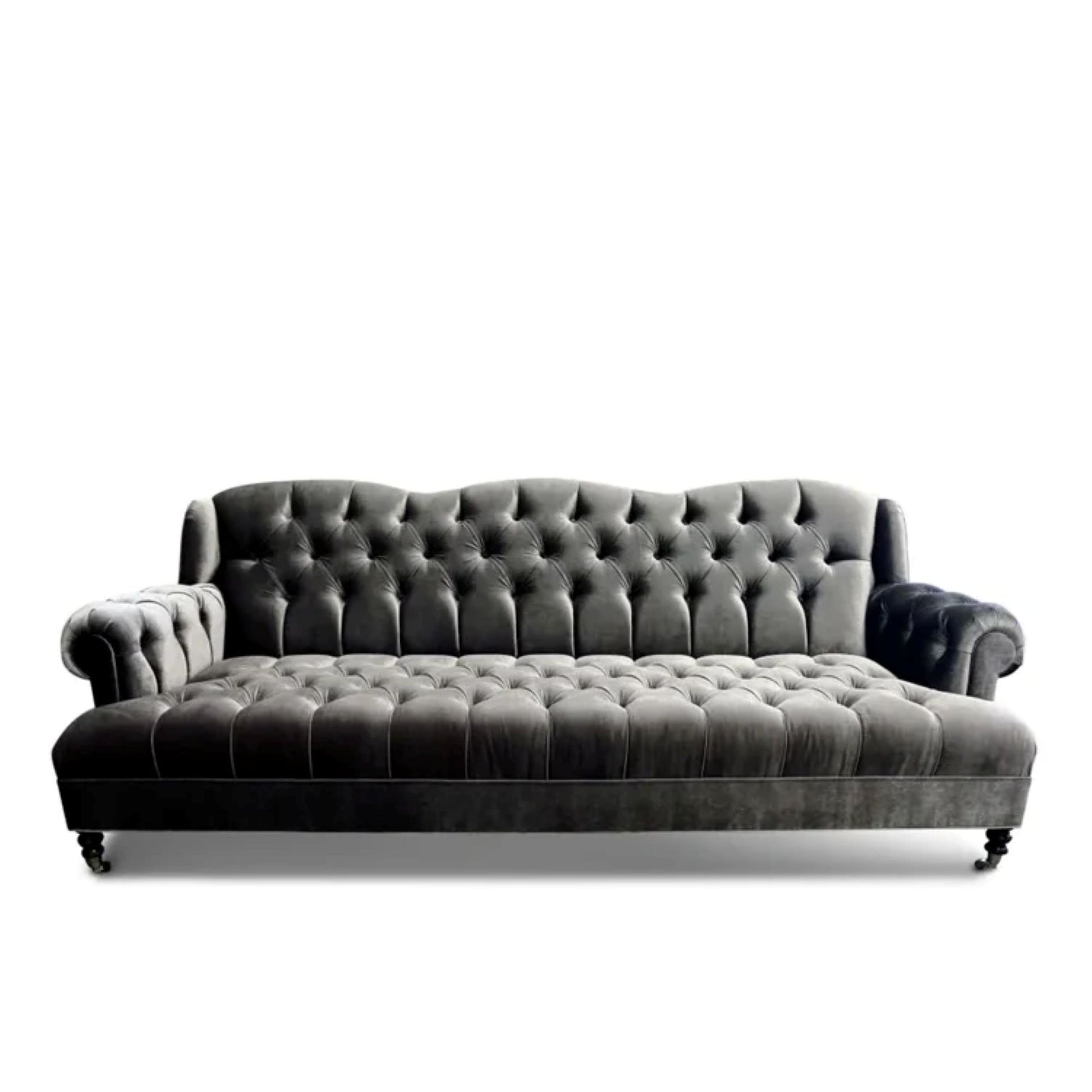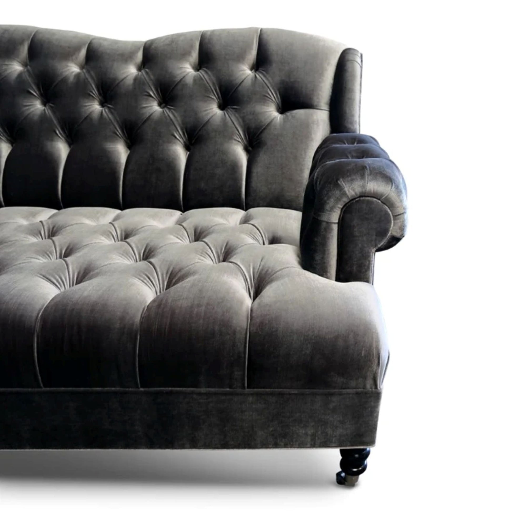 The Phil Slate Velvet Sofa is a luxurious, handcrafted piece that combines timeless elegance with exceptional comfort. Upholstered in Shimmer "Slate" velvet, this sofa features self-welt detailing, self-covered buttons, and black legs with brushed brass casters. With its elegant silhouette and tufted upholstery, the Phil Slate Velvet Sofa is perfect for those seeking both style and substance.