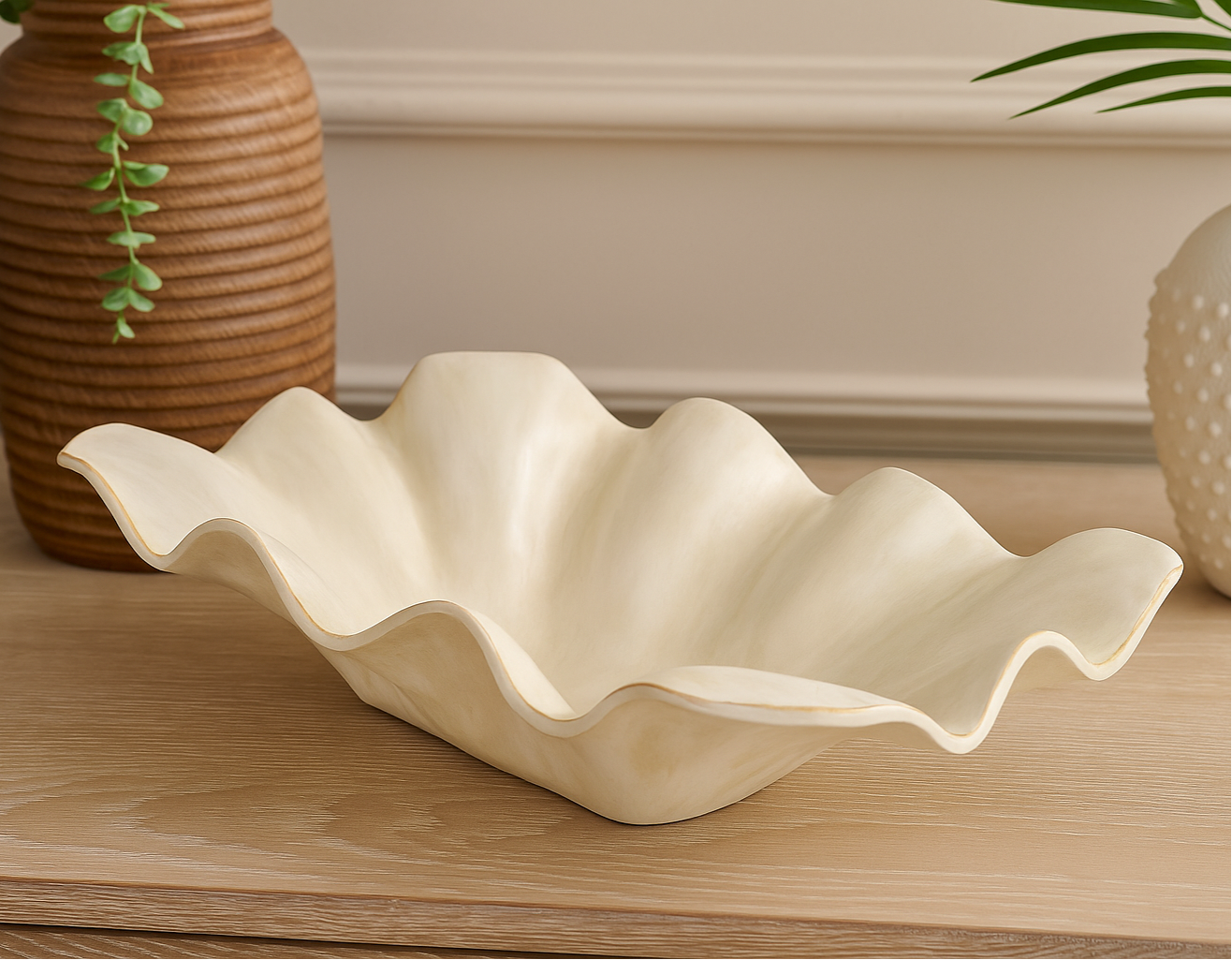 Enhance your interior with the Stefani Wave Bowl with Gold Accents. Its flowing wave-inspired form, soft cream finish, and subtle gold detailing create a harmonious blend of elegance and artistry. Whether showcased on its own or used to display decorative accents, this sculptural bowl brings a refined, contemporary touch to any space.