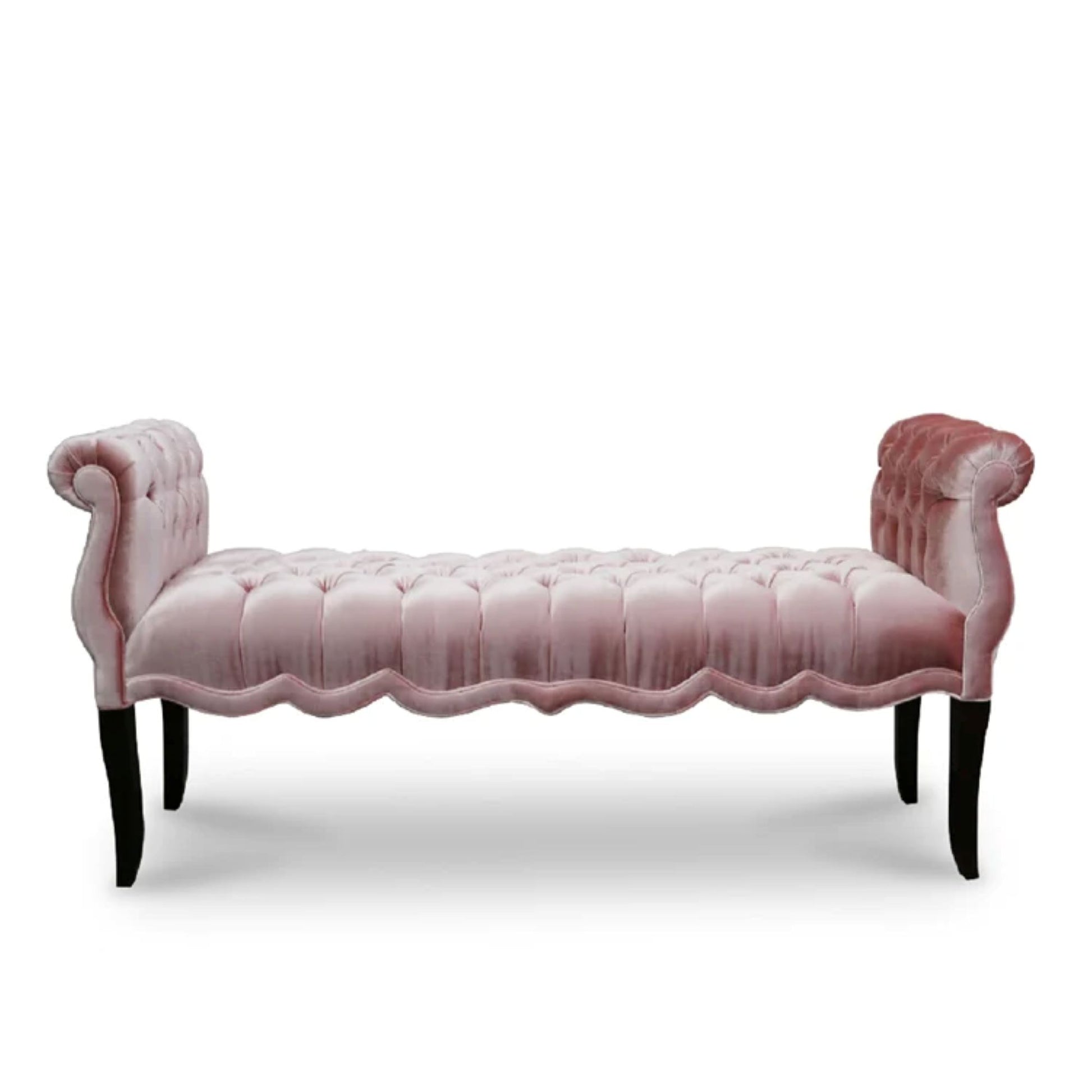 The Twyla Bench is a beautifully handcrafted, made‑to‑order piece that brings together elegant design, plush upholstery, and graceful proportions. Upholstered in coral velvet with self‑welt and self‑buttons, perched on dark walnut legs, this bench serves as both a luxurious seating option and a refined statement.